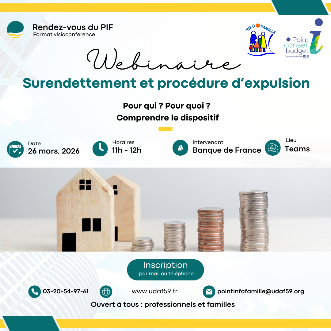 Le Point Info Famille a le plaisir de vous inviter à son prochain Rendez-vous : « Surendettement et procédure d’expulsion », animé par la Banque de France.
